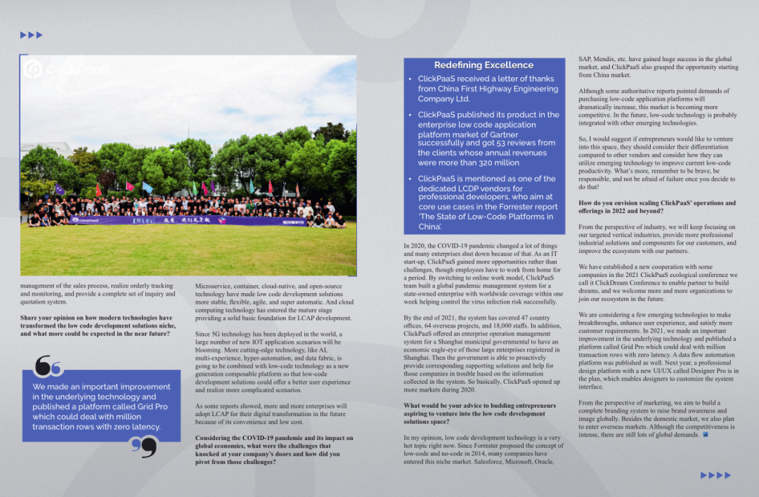 2022年年初,ng28电子游戏官网入口入选外媒Insights Success低代码/无代码开发平台 Top10,创始人、CEO胡柏受邀接受专访并荣登封面人物,他与Insights Success的读者分享了ng28电子游戏官网入口成立的初心、发展历程、当前的行业发展趋势以及他对公司未来的展望。